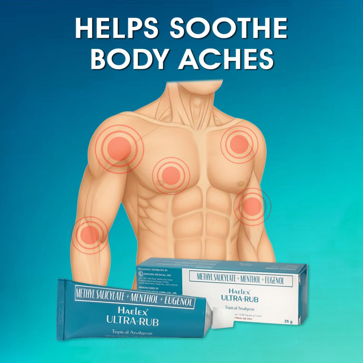 Haelex Ultra-Rub (Methyl Salicylate+Menthol+Eugenol)Haelex Ultra-Rub is a topical cream containing Methyl Salicylate (102 mg/g), Menthol (54.40 mg/g), and Eugenol (13.60 mg/g). It is a white cream with an aromatic scent, packed in a 25 g aluminum collapsible tube.