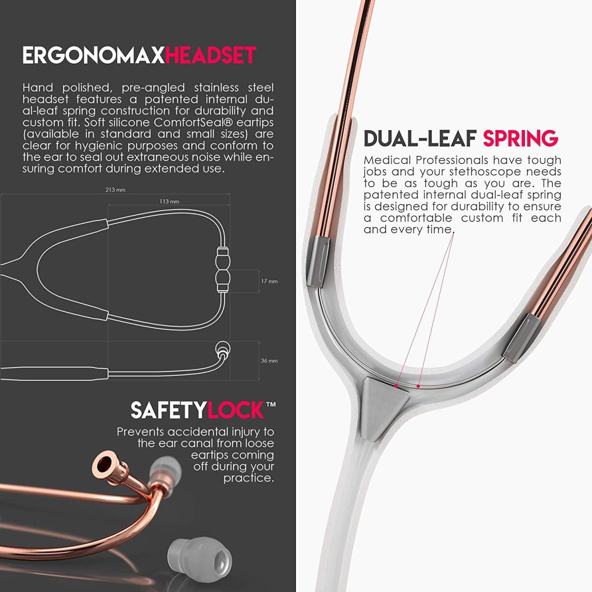 Our patented SafetyLock eartip adapters lead the industry in user safety by creating a larger surface area on which the eartip sits. Most stethoscopes just have a 3mm gauge headset where the eartip sits. If the eartip comes off this can easily puncture your inner ear. The MDF® SafetyLock™ system rests on a 5mm gauge headset and provides ample surface area to prevent this.